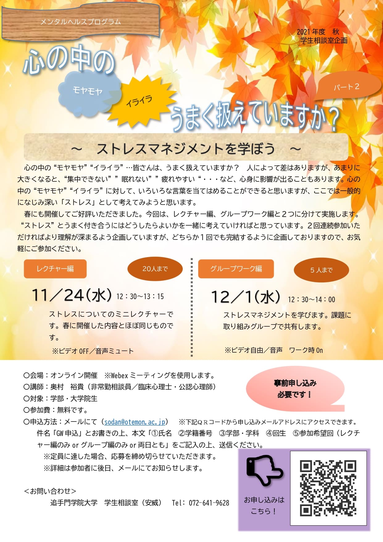 学生相談室では個別相談以外に、自己発見や交流の機会として様々なイベントを実施していますので、ふるってご参加ください。