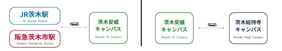 ●大阪モノレール宇野辺駅の改札を出てモノレール沿いの歩道を進み、 下穂積1丁目の交差点を北に向かい「イオンモール茨木」北側を 右折してすぐがバスのりばです。[徒歩約9分]