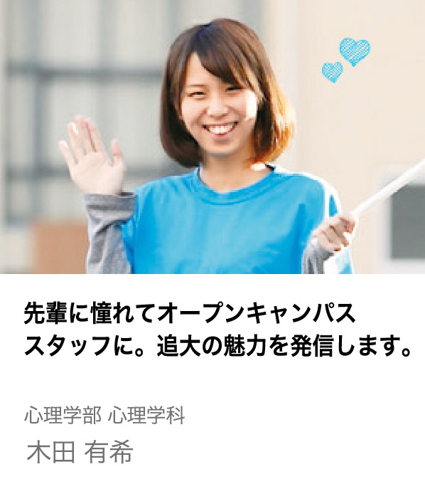 等身大の追大生を見てほしい!オープンキャンパスで大学の魅力を発信。 心理学部心理学科 武元 沙耶