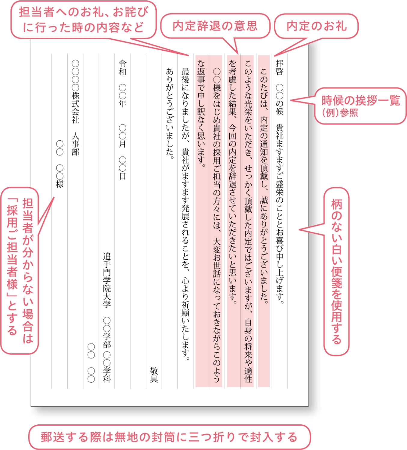 ❶ 電話にて内定辞退を了承いただいた場合、速やかに人事担当者にお詫び状を封書にて郵送しましょう。