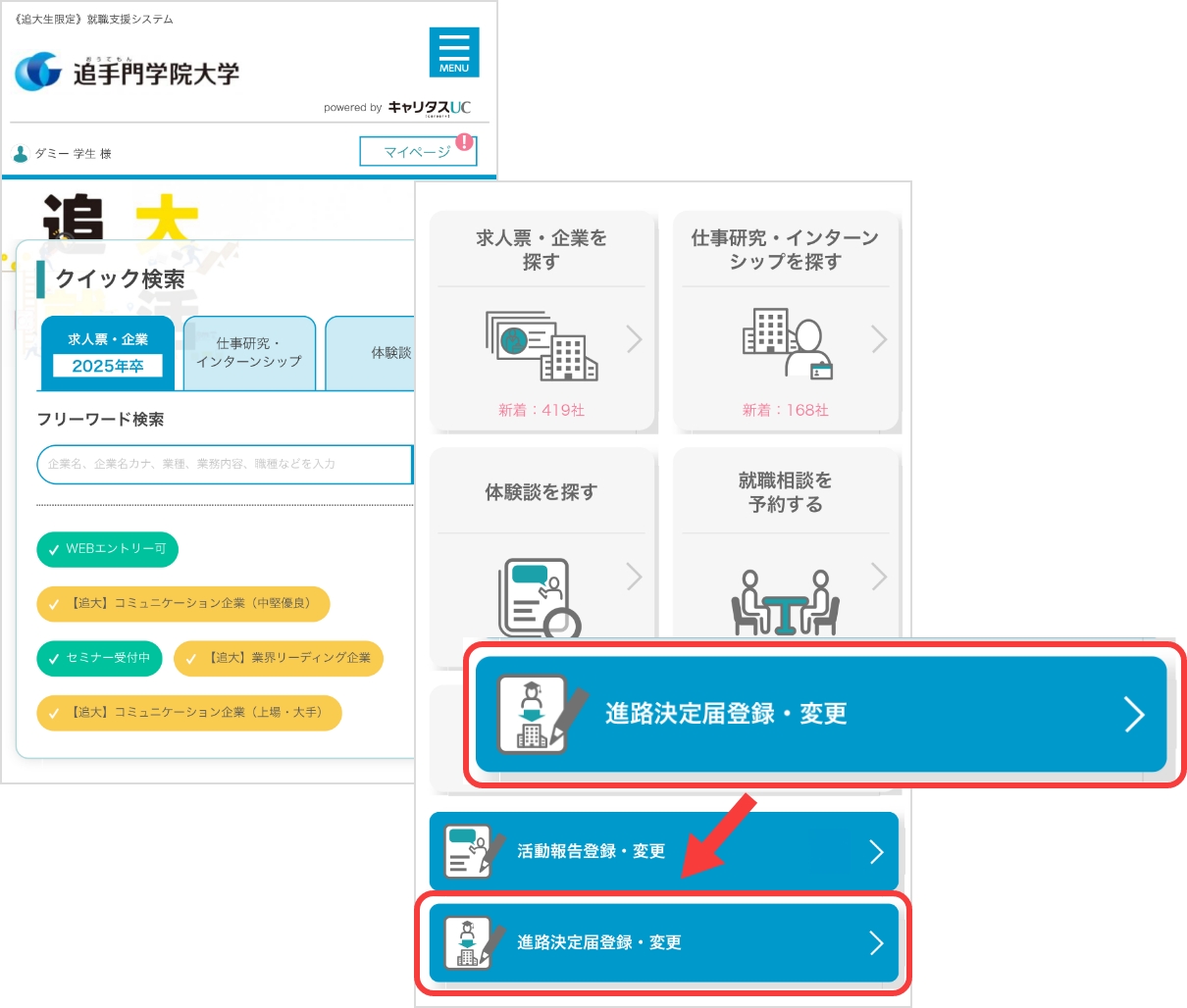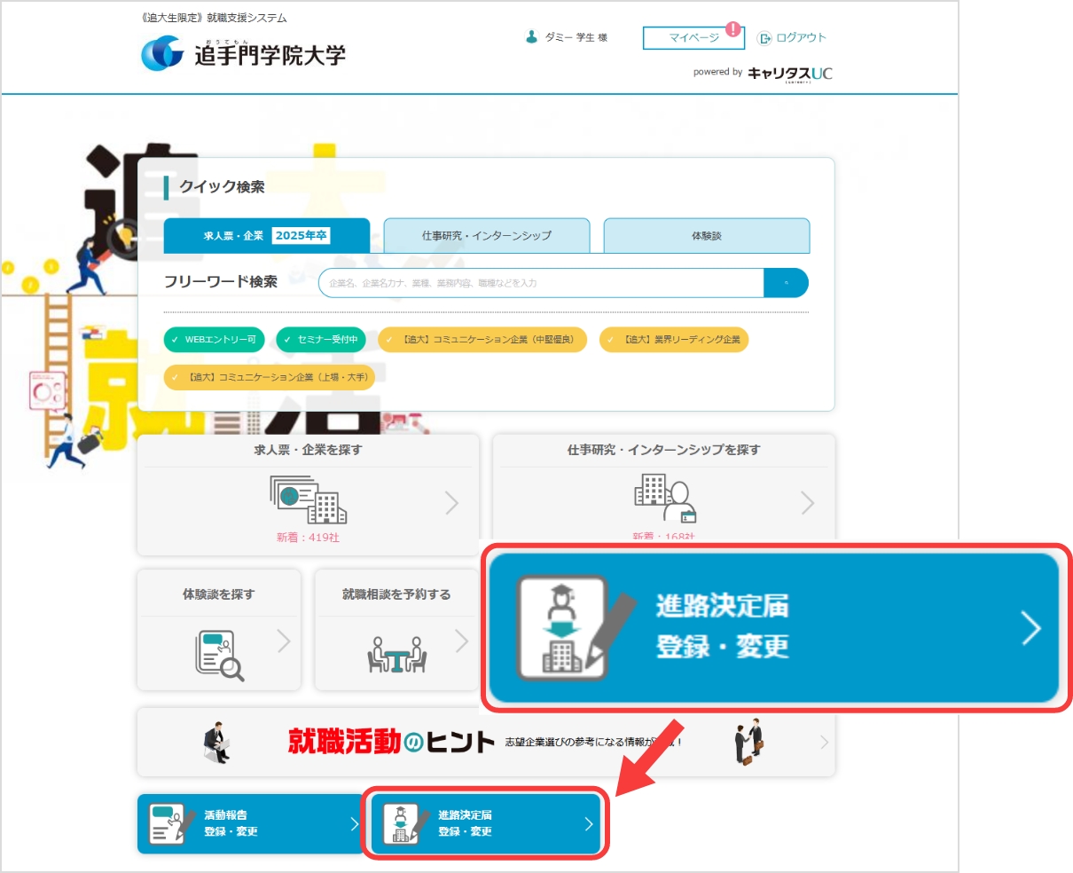 卒業後の進路が最終的に決定したら、追大就活で速やかに登録してください。