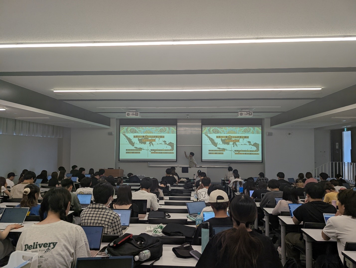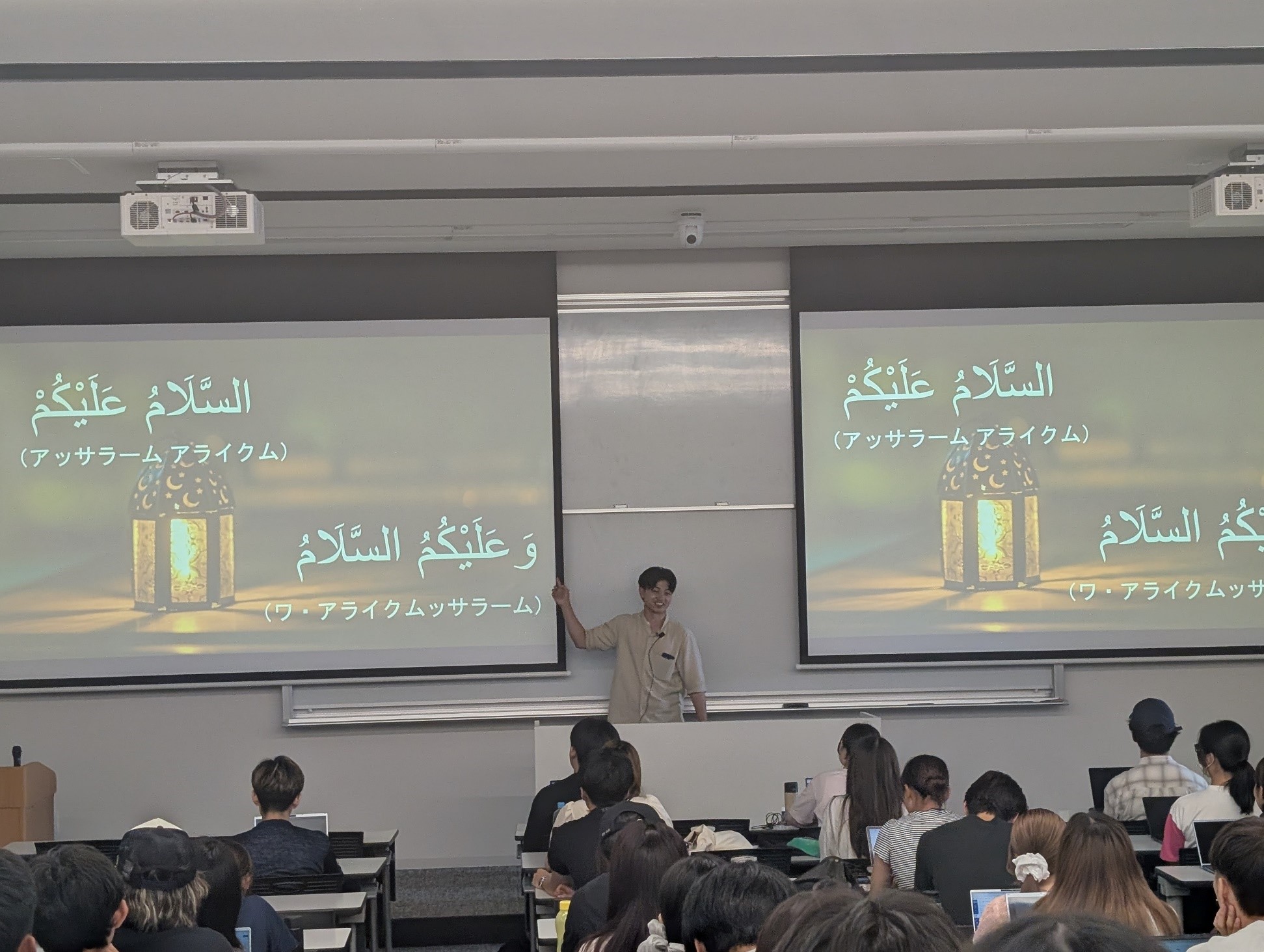テーマは、日本の学生にとって比較的馴染みのある事柄から入り、それらを手がかりにイスラムにおける価値観や規範、信仰の意味を分かりやすく説明する構成としました。約100名近い学生を前に直接講義を行うことができたことは、私にとって非常に貴重な経験となりました。学生たちが真剣に耳を傾け、驚きや関心の表情を浮かべながら参加してくれた姿が強く印象に残っています。