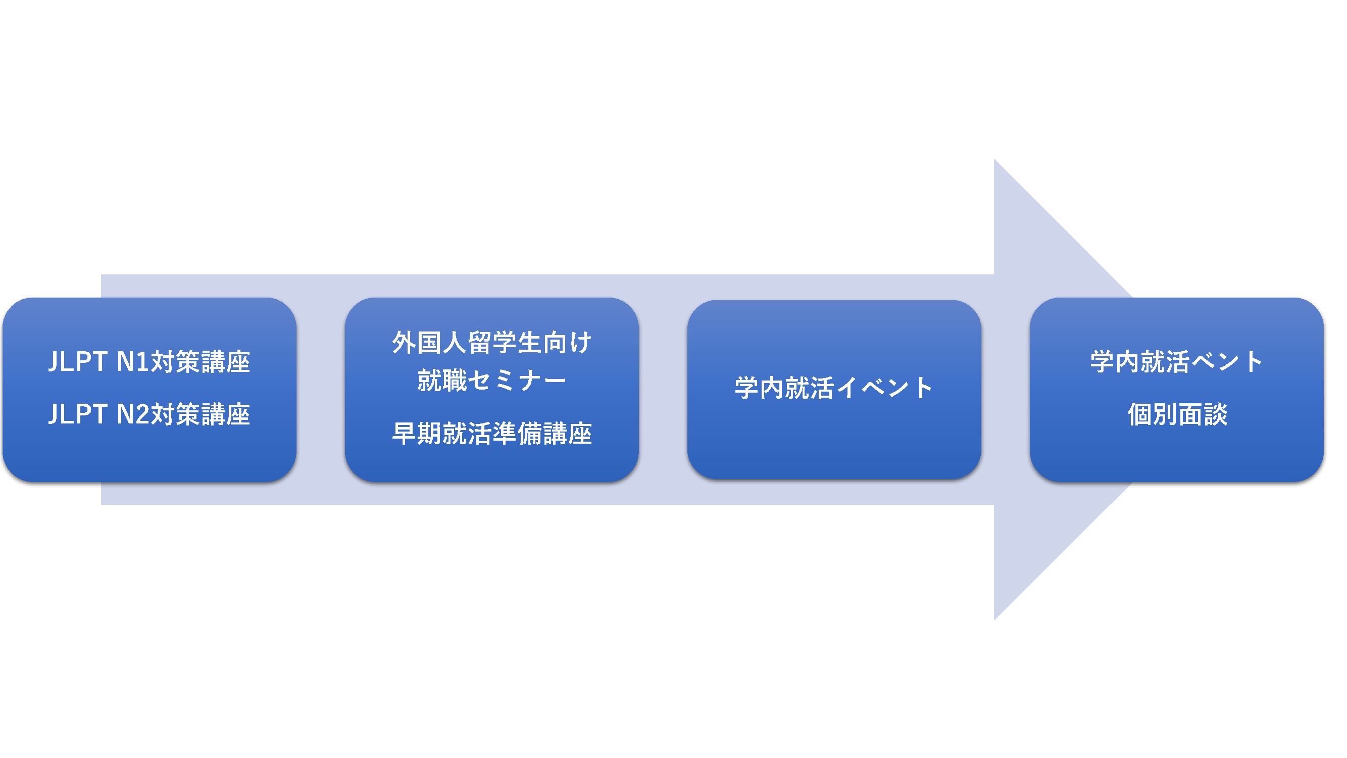 追手門学院大学では、日本で就職を希望している私費外国人留学生の皆さんに、年間を通して様々な支援を実施 しています。就職活動のスケジュールや注意しておくべきポイントについて、早期の段階から情報を収集し、計画的に就職活動を進めて内定獲得につなげましょう。