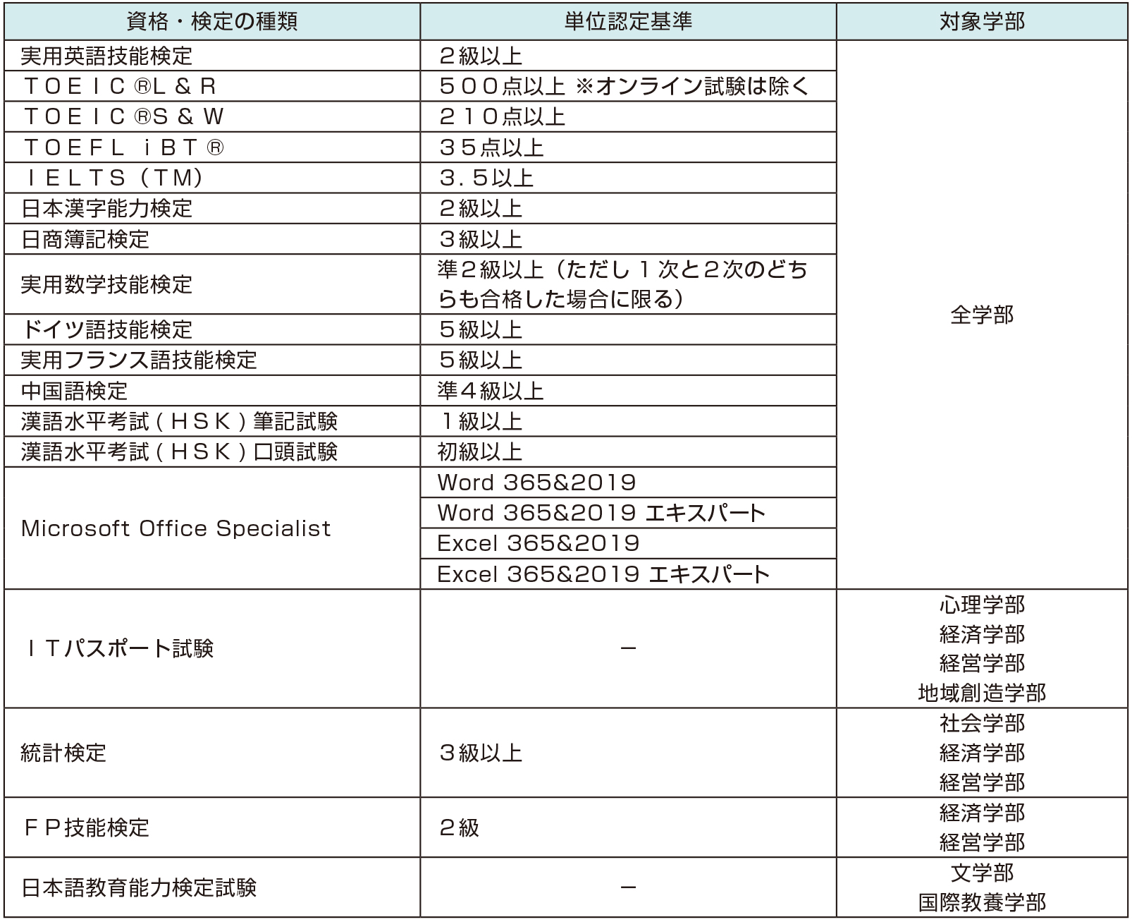 指定された資格・検定について、本学入学後に、定められた基準以上の成績を修めた場合に、単位を認定します。単位修得を目指す学生は、春学期及び秋学期の開始時のいずれかの期間に、事前に CAMPUS SQUARE にて登録手続きを行う必要があります。詳細については学期開始初旬月にOIDAIアプリ>お知らせにてお知らせします。手続きをせずに資格・検定試験の基準を満たしても単位認定は行いませんので、注意してください。ただし、本学在籍中に取得した資格・検定科目であれば、登録手続きを行うことで、次年度以降に単位が認定されます。