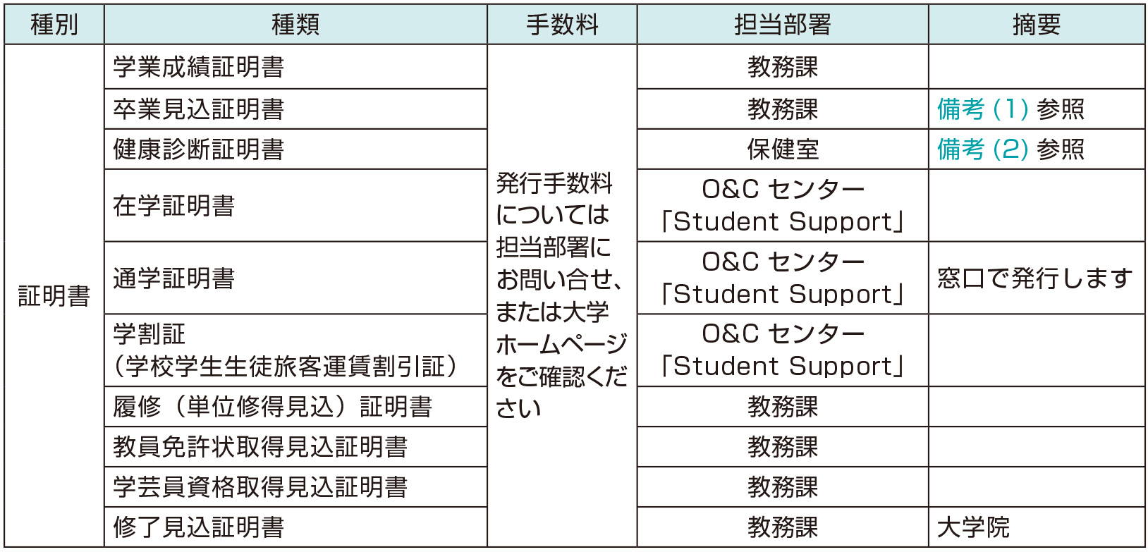 在学証明書、卒業見込証明書、修了見込証明書、学業成績証明書、健康診断証明書、履修(単位修得見込) 証明書、教員免許状取得見込証明書、学芸員資格取得見込証明書、在学証明書(英文)、卒業見込証明書(英文)、修了見込証明書(英文)、学業成績証明書 (英文)、履修(単位修得見込)証明書(英文)