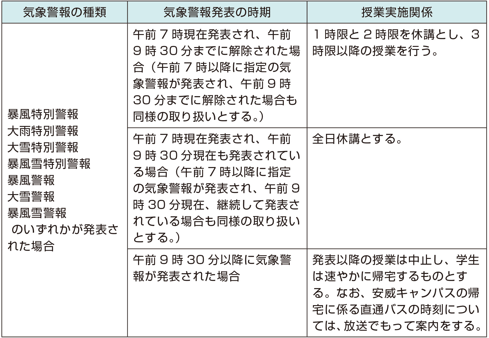 気象警報が発表された場合の授業の実施は次のとおりとなります。