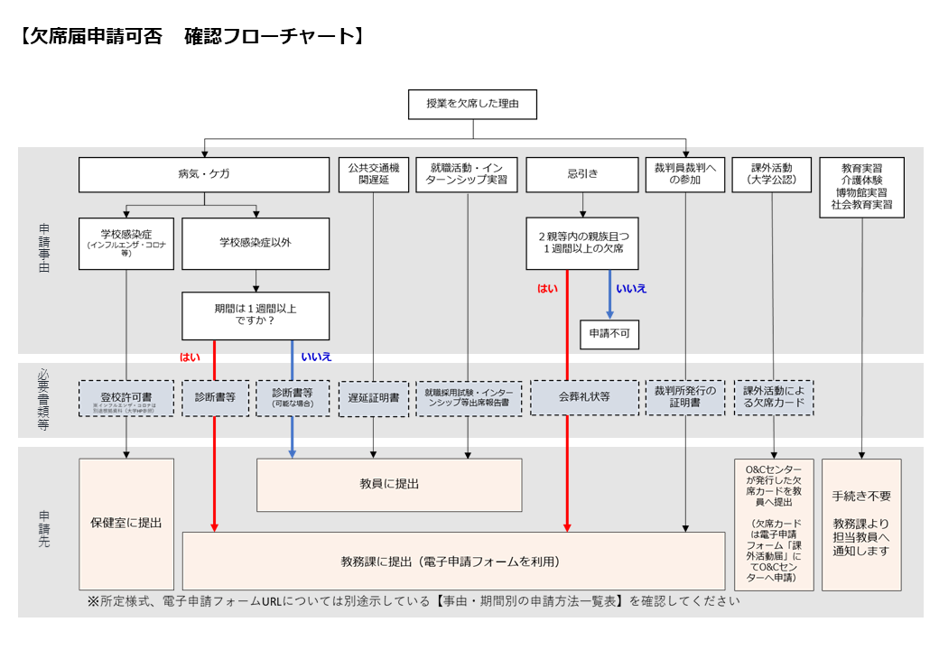 病気やケガ、公共交通機関の遅れ等、やむを得ない事情により授業を欠席する場合は手続きが必要です。事由や期間によって申請方法・申請先が異なりますので、以下のSTEPに沿って申請手続きを行ってください。