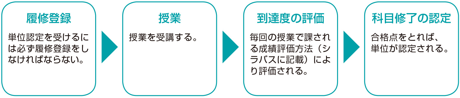 各学部・学科の教育課程(カリキュラム)にしたがって授業科目を履修し、授業1回ごとに行う小テストやレポート課題などの結果の積み重ねによる総合的な評価をうけ、合格と判定されたとき、その授業科目の単位が認定されます。