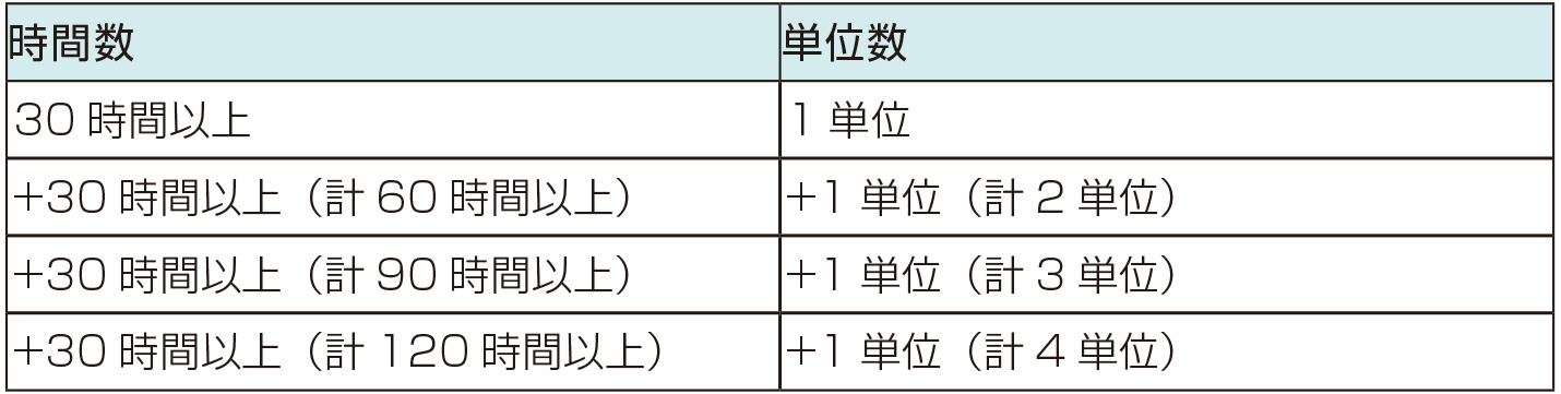 下表の通り、実習時間に基づいた単位数を認定します。