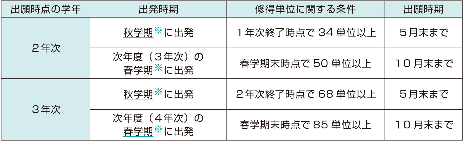 申請資格・出願時期:出発する時期により異なります。(下記の表参照)