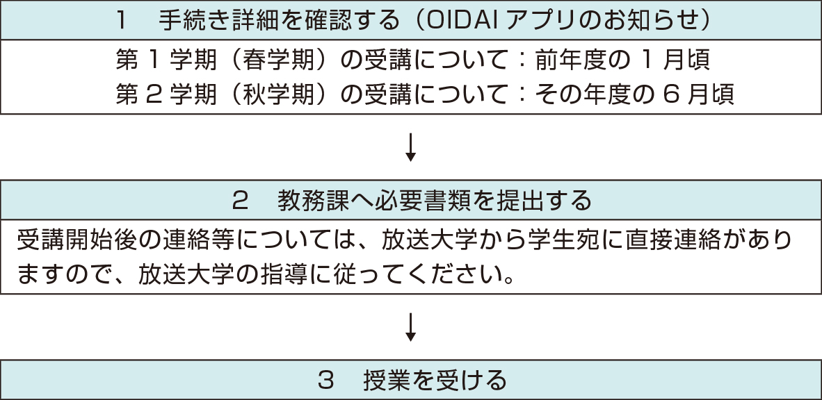 本学と放送大学は単位互換協定を結んでおり、放送大学の提供するテレビ・ラジオ・インターネットによる学習にて修得した単位を認定します。放送大学の科目を受講するには、所定の手続きを行う必要があります。詳細についてはOIDAIアプリ>お知らせにてお知らせします。放送大学の授業は、第1学期(4月~7月)、第2学期(10月~1月)に実施され、本学では第1学期を春学期、第2学期を秋学期として扱います。