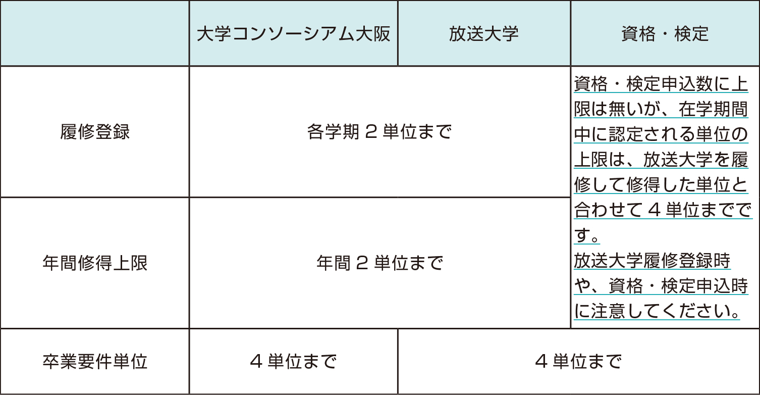 - •大学コンソーシアム大阪単位互換協定により単位を修得した場合に認められる単位(以下、大学コンソ単位と言う)は履修単位制限に含まれません。なお、各学期の履修の上限は、前述の放送大学の科目と合わせて年間2単位までとなります。