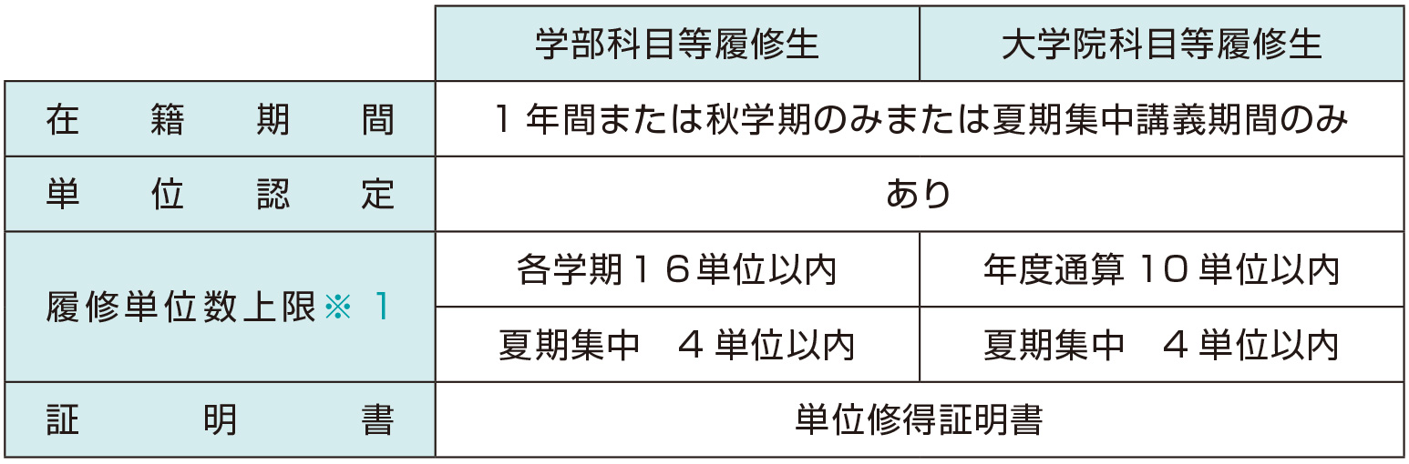 また、中学校又は高等学校教育職員免許状授与資格、学芸員または社会教育主事任用資格など、資格を取得することを目的とする場合は、必要な基礎資格を有することが条件となります。科目等履修生により資格を取得しようとする場合は、必ず事前にStudent Supportへ相談してください。