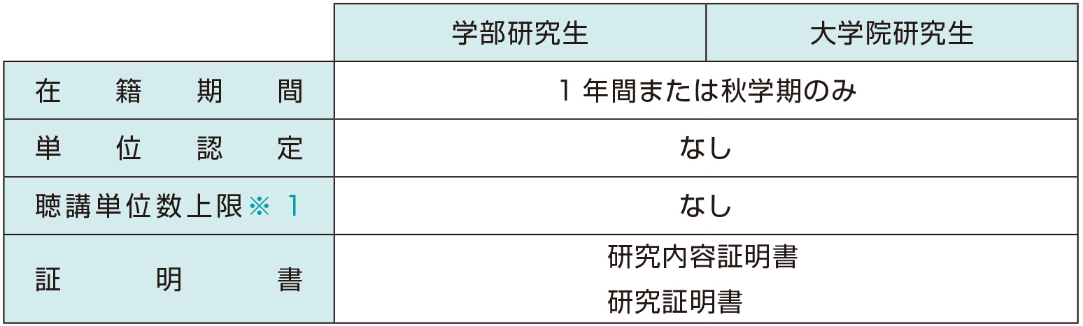 特定のテーマに基づいて、指導教員のもとで授業を聴講しながら、専門的な研究を行います。「研究報告書」(本学所定用紙)を提出することで、研修終了となります。研究生は学部および大学院の講義を聴講し、演習に参加することができますが、単位は与えられません。