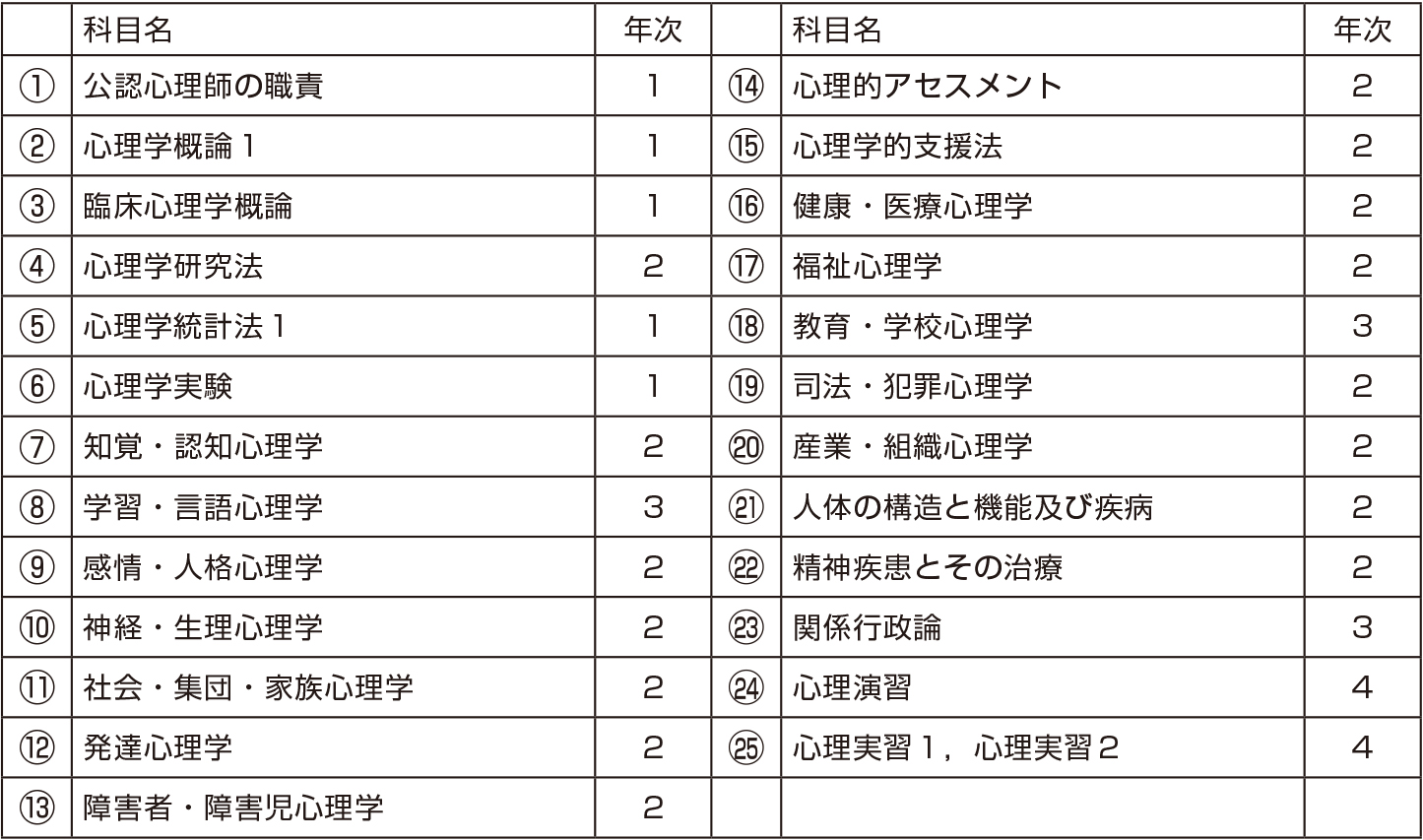 公認心理師法が定める「大学における公認心理師となるために必要な科目」として、本学が開講する科目は、以下の25科目です(ただし、「心理実習1」及び「心理実習2」は両科目とも履修及び単位修得が必要です)。また、科目名の隣の「年次」の欄に記載されている数字が、その科目が開講される学年です。公認心理師の資格取得を目指す方は、以下の一覧を参考にして、計画的に履修しましょう。