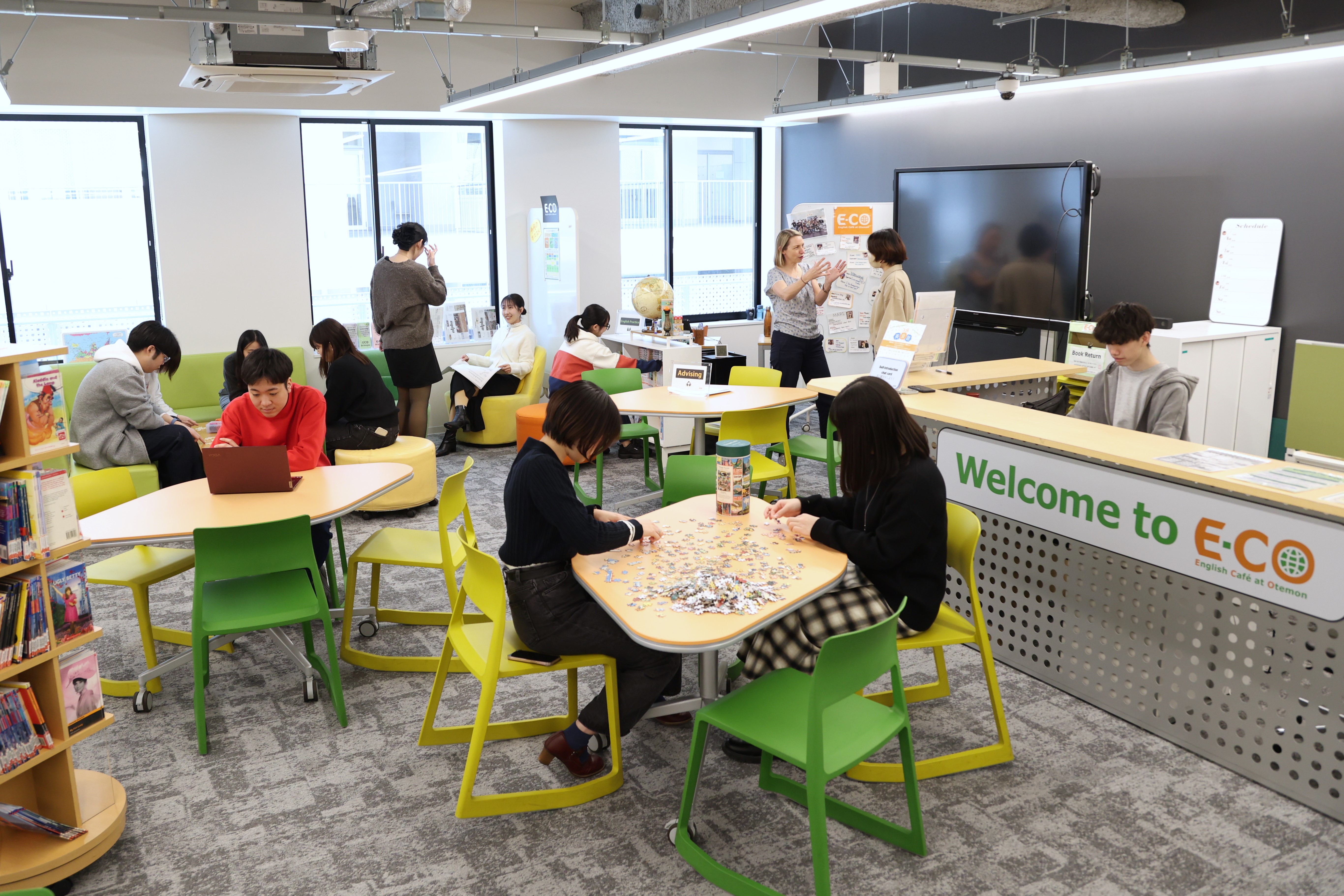English Café at Otemon (E-CO) is a social learning space and self-access center established in April 2013 to promote global communication skills, self-directed language learning and international exchange for all students and staff on campus.