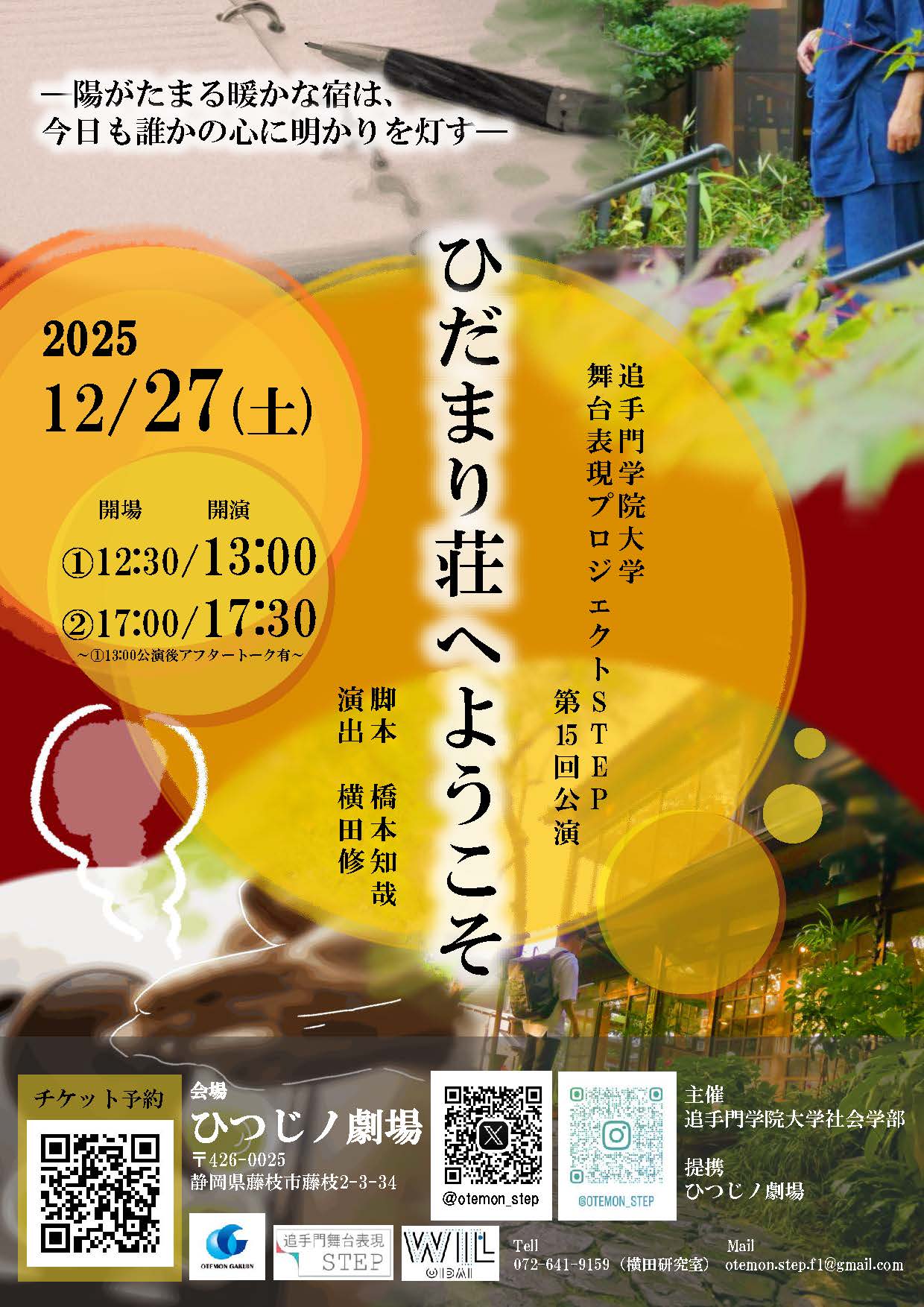 このたび、追手門学院大学社会学部 舞台表現プロジェクトSTEP 第15回公演『ひだまり荘へようこそ』を、ここ藤枝市・ひつじノ劇場で上演できますことを心より感謝申し上げます。