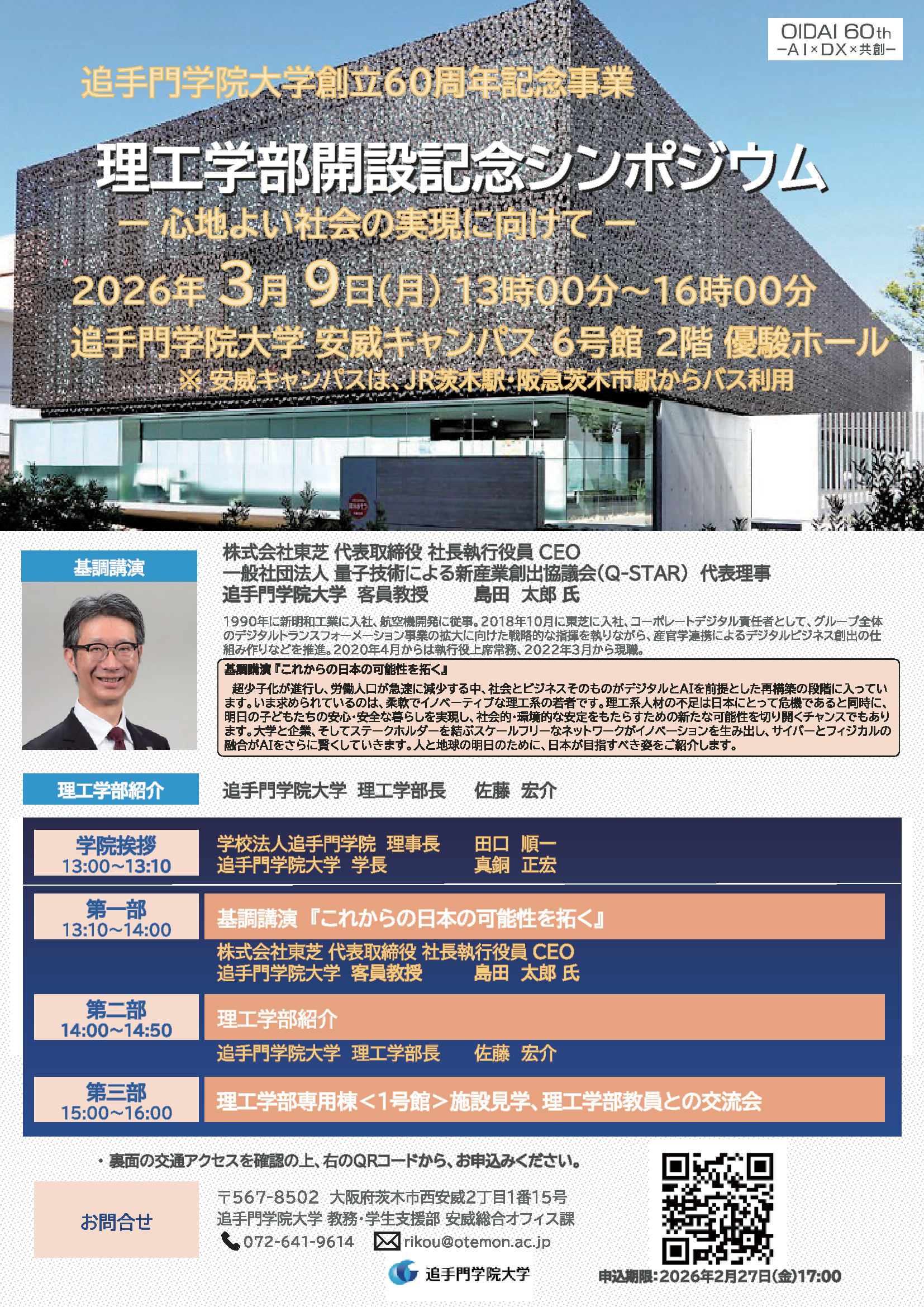 追手門学院大学創立60周年の記念事業として、「理工学部開設記念シンポジウム - 心地よい社会の実現に向けて-」を開催します。 シンポジウムでは、株式会社東芝 代表取締役 社長執行役員 CEO、追手門学院大学 客員教授 島田太郎氏をお迎えし、基調講演を行うほか、2025年度に開設された理工学部の紹介及び理工学部の専用棟施設見学を行います。