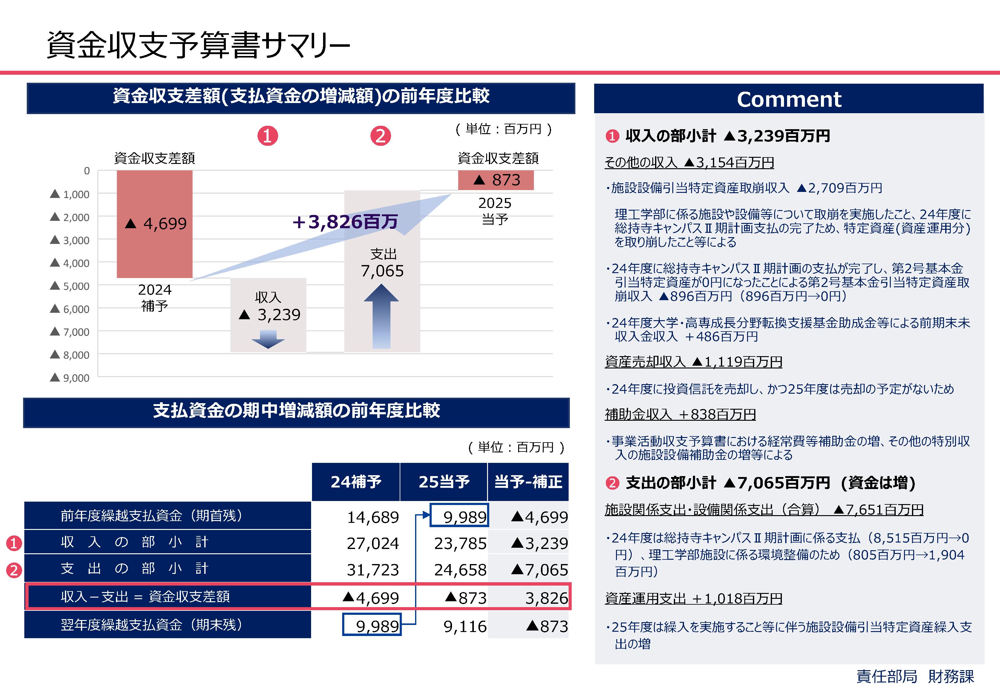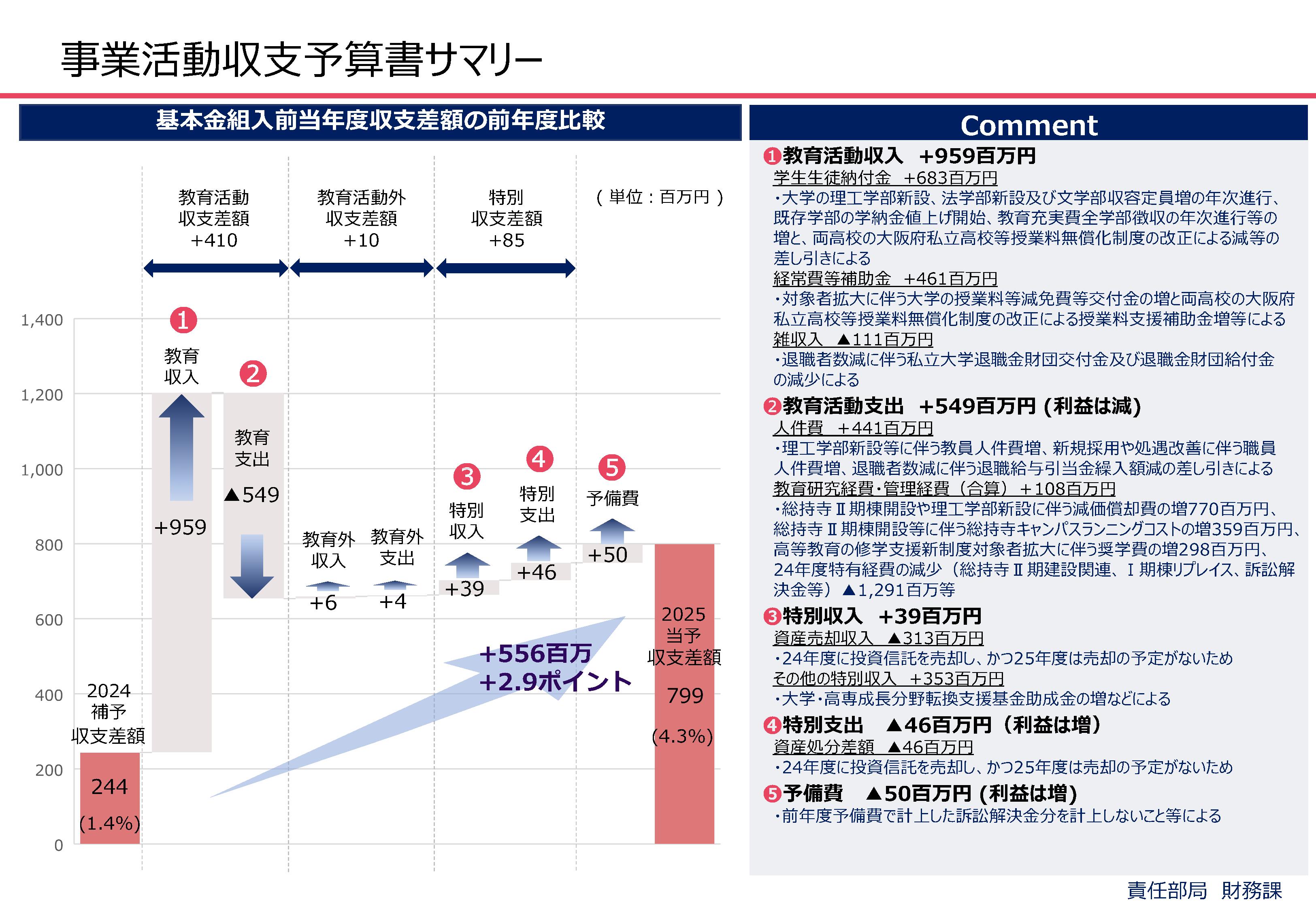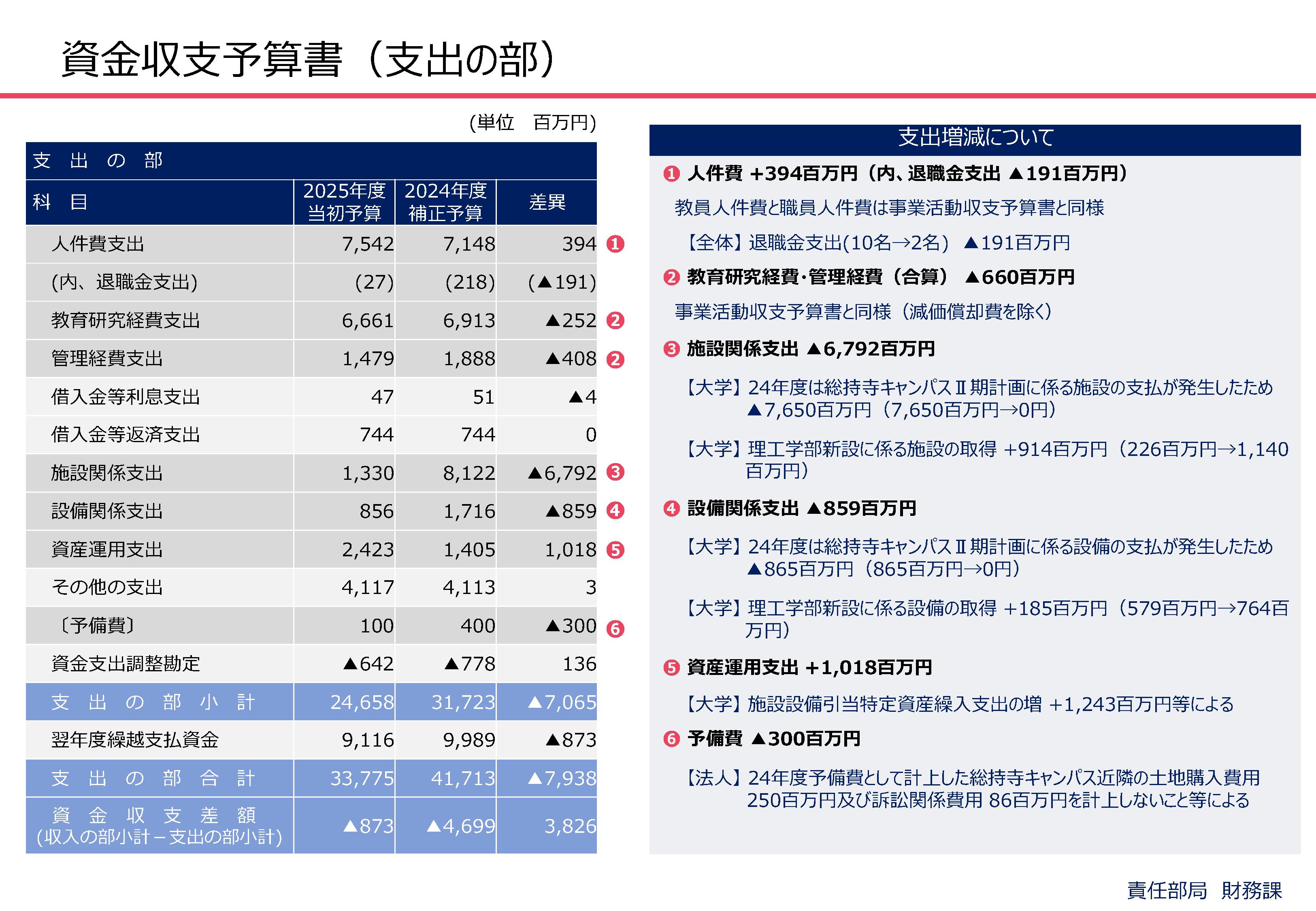 この達成に向け、必要と考えられる箇所については積極的に資金を配分していくつもりですが、支出できる資金には限りがあります。とりわけ、来年2025年度からは第二の開学と位置付ける大学における総持寺・安威との2キャンパス化に伴い、さらに多くの資金需要が見込まれています。
