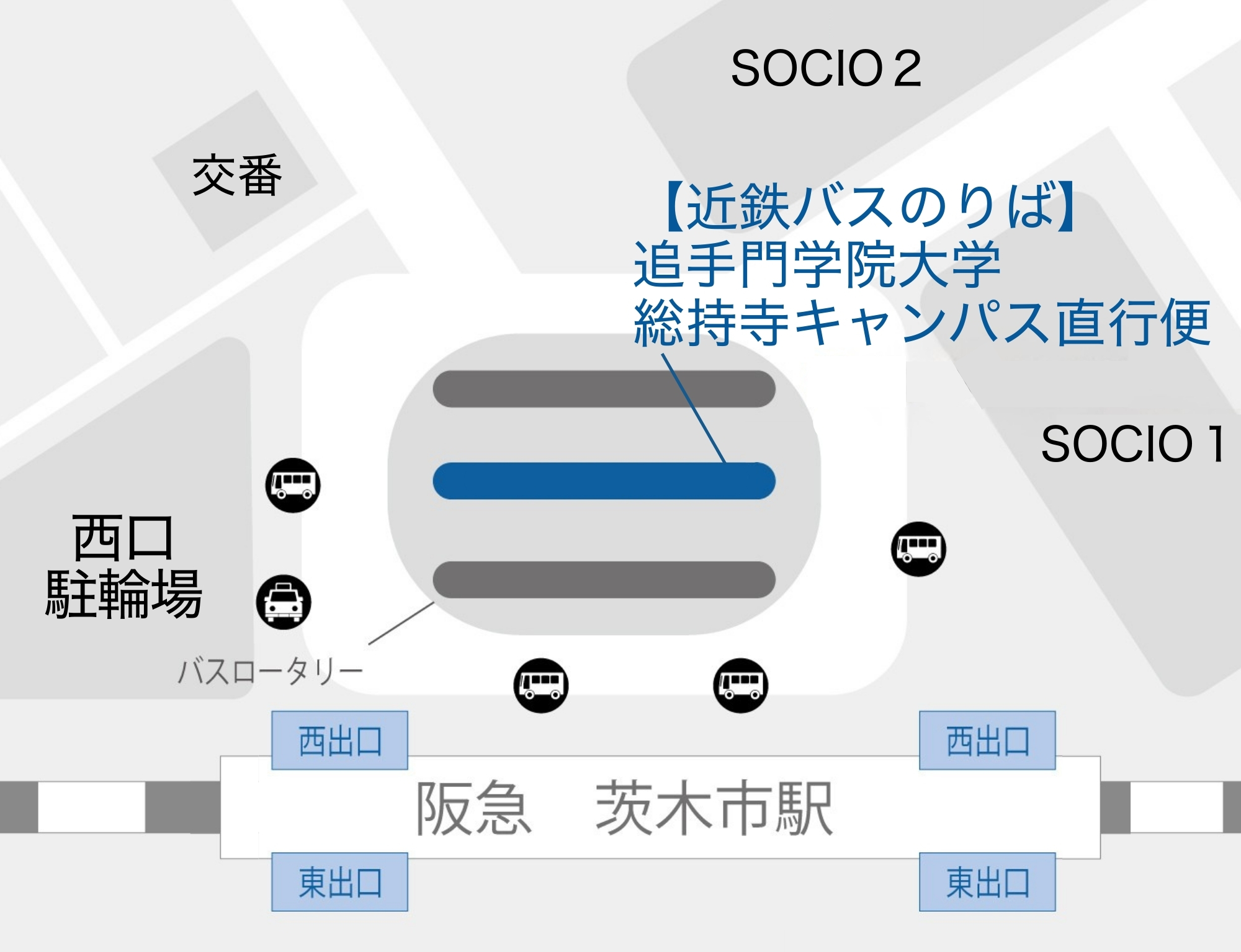 西出口を出て、 近鉄バスターミナル2番のりば➂から「〔直行〕追手門学院大学総持寺キャンパス」行きに乗車してください。