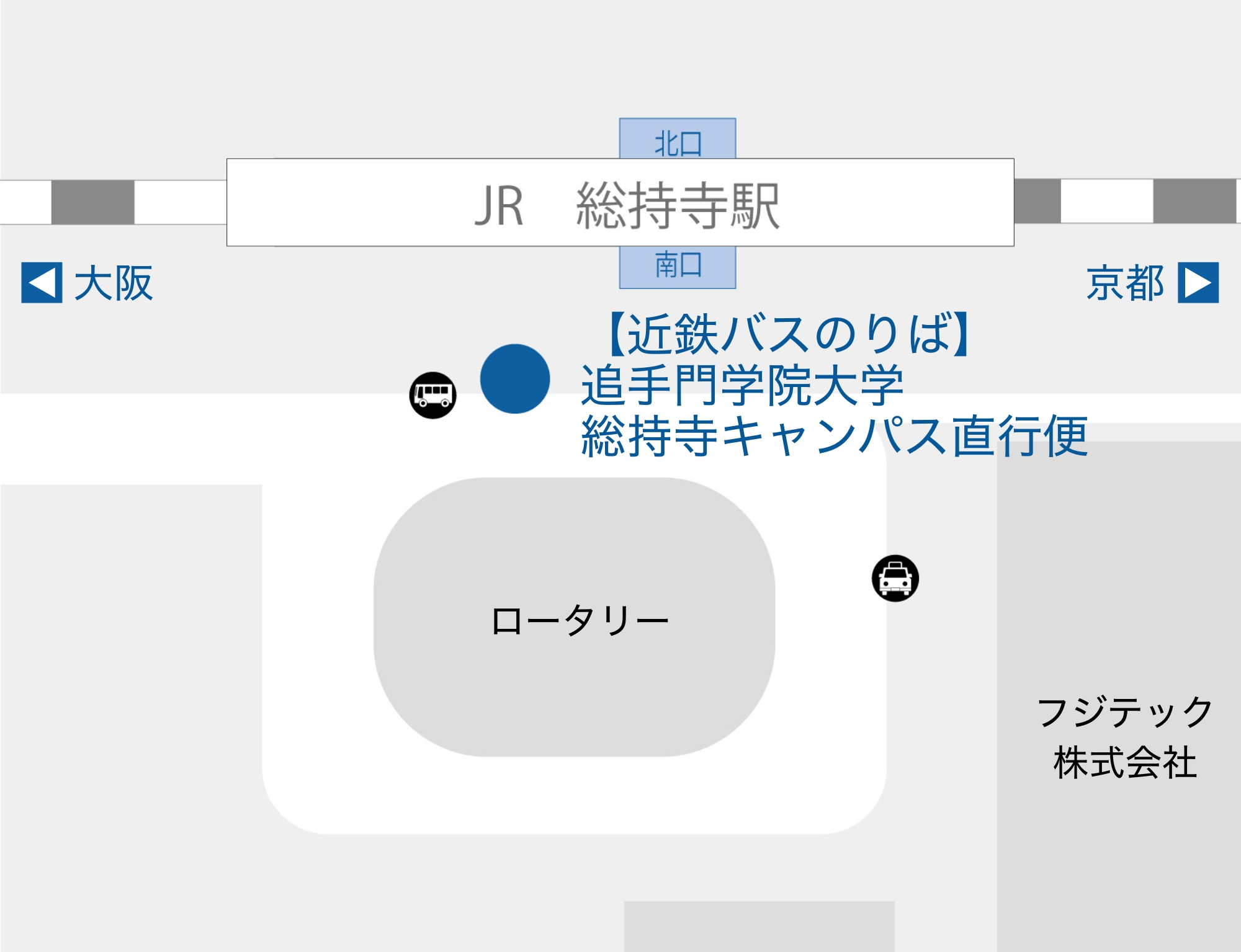 ロータリーの近鉄バス停留所「JR総持寺駅」から近鉄バス 茨木線 ・ 系統「花園・東和苑」行きに乗車し、「追大総持寺キャンパス前」で下車してください。