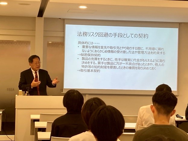 ビジネス活動にはリスクがつきものであり、企業法務の目的は「企業活動に伴う法的リスクを①回避し、②極小化することである」というお話や、契約書チェックなど予防法務の仕事が業務の7割から8割を占めている一方で、ここ最近ではM&Aや海外進出など戦略的な法務の仕事が増えているという、第一線で企業法務に従事された方ならではのお話を伺うことができました。