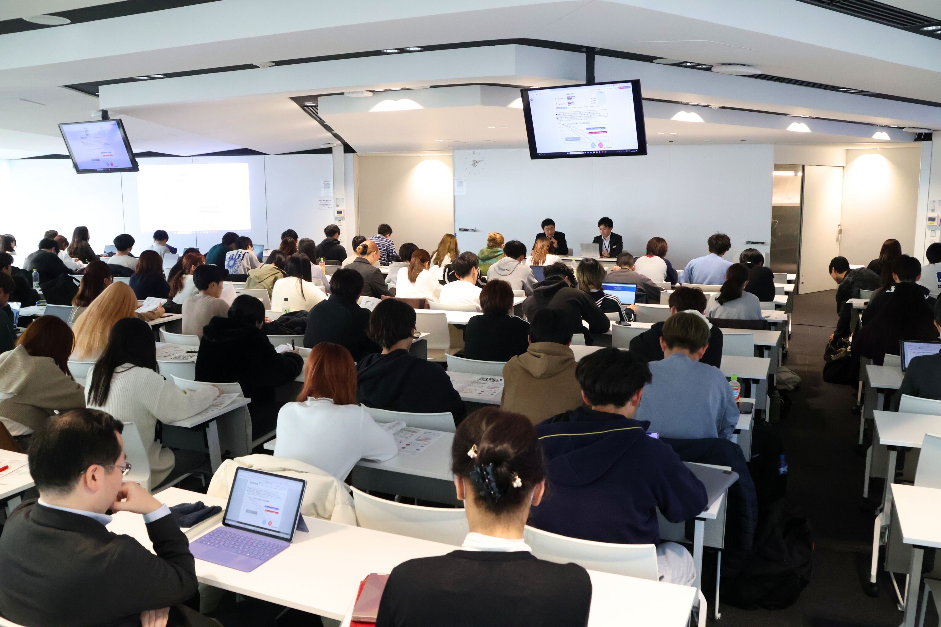 2025年12月2日(火)、追手門学院大学法学部では、講師に三菱UFJ銀行の方を招き、「将来の資産形成を学ぶ」をテーマとした金融経済教育プログラムを実施しました。1年生ゼミ15クラスが合同で参加し、会場には200名を超える学生が集まりました。