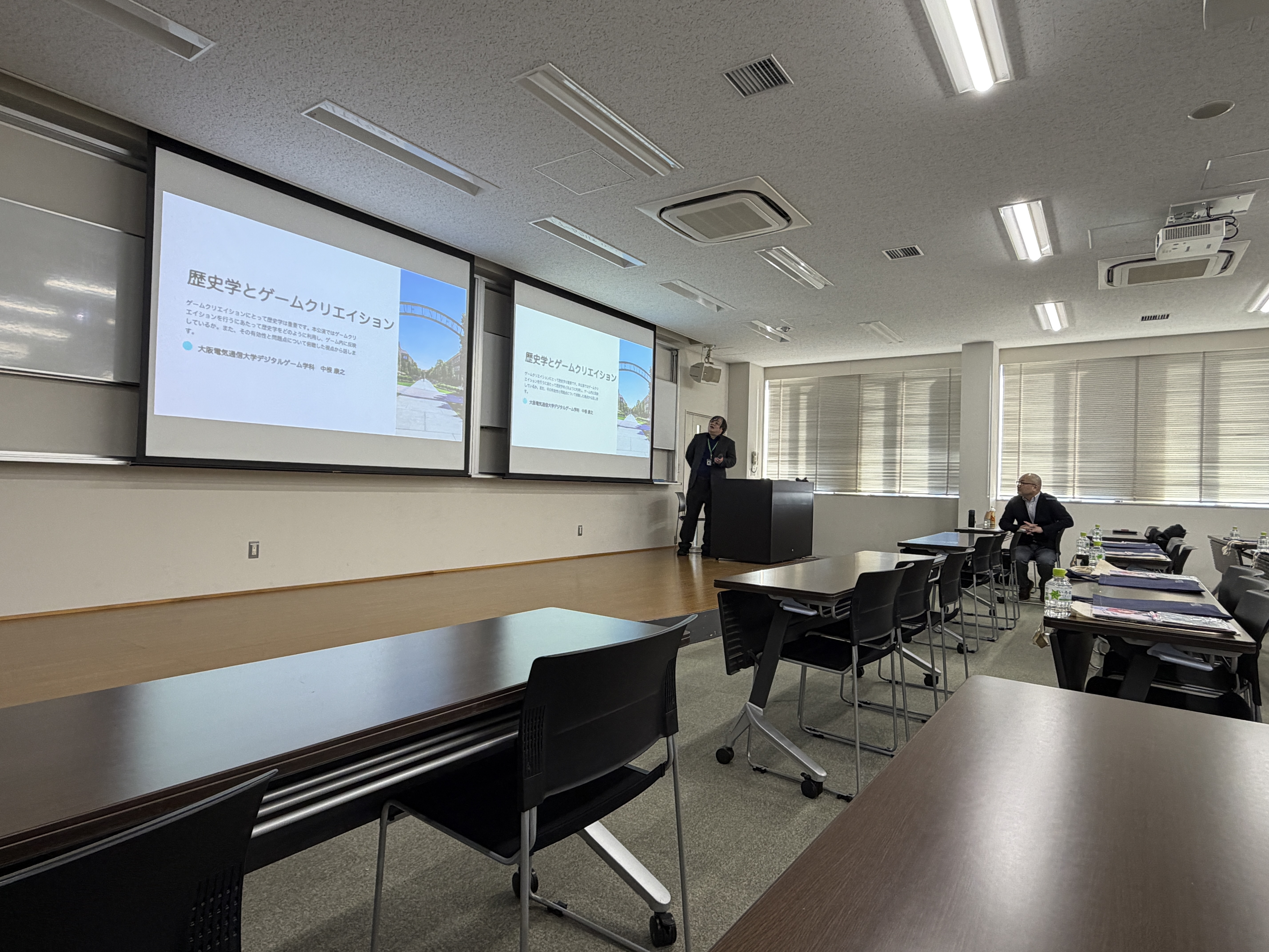 本学と教育・研究等に関する連携協定を締結している大阪電気通信大学総合情報学部デジタルゲーム学科の中根 康之准教授が、ゲームクリエイションを行うにあたって歴史学をどのように利用しゲーム内に反映しているか、また、その有効性と問題点について講演しました。