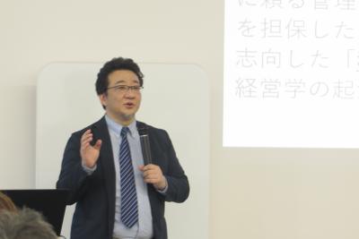 理論編講義では、村上喜郁教授(経営学部)が登壇。経営戦略と組織マネジメントの関係性を軸に、企業が持続的に価値を創出するための構造について講義が行われました。戦略の実行を支える組織設計や、人材マネジメントとの接続について整理しながら、受講者自身の企業事例に引き寄せて考える時間となりました。アンケートでは、