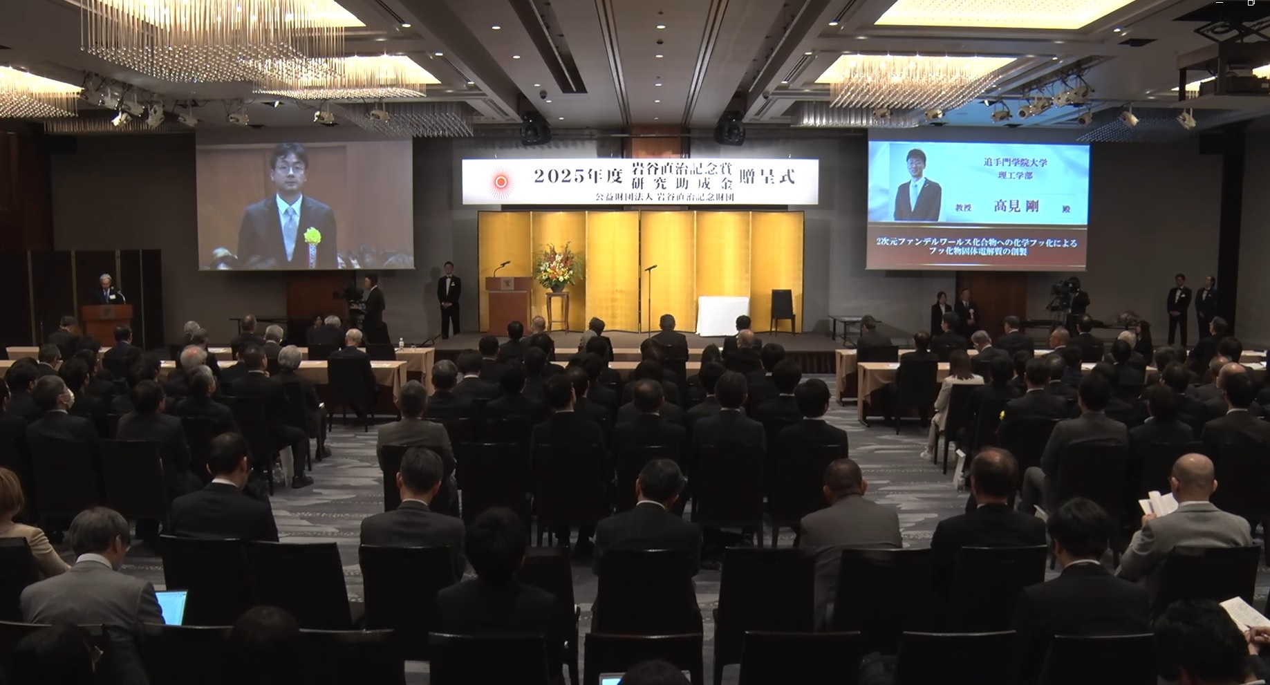 3月6日(金)に東京會舘で行われた、公益財団法人 岩谷直治記念財団の第52回岩谷科学技術研究助成の贈呈式に、理工学部電気電子工学科 高見剛教授が出席し、研究題目「2次元ファンデルワールス化合物への化学フッ化によるフッ化物固体電解質の創製」に対する贈呈書が授与されました。