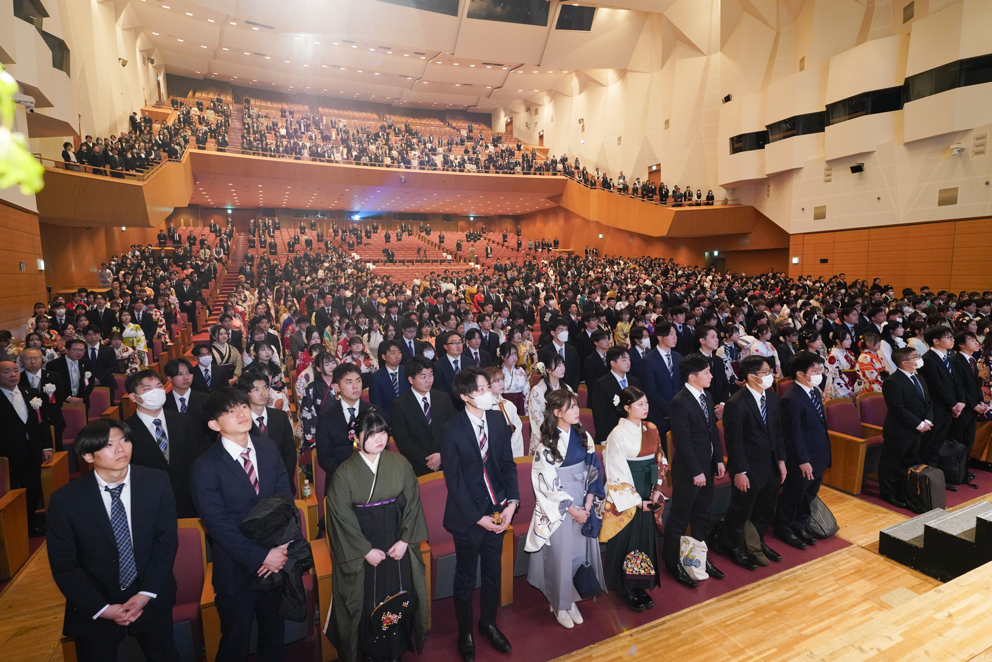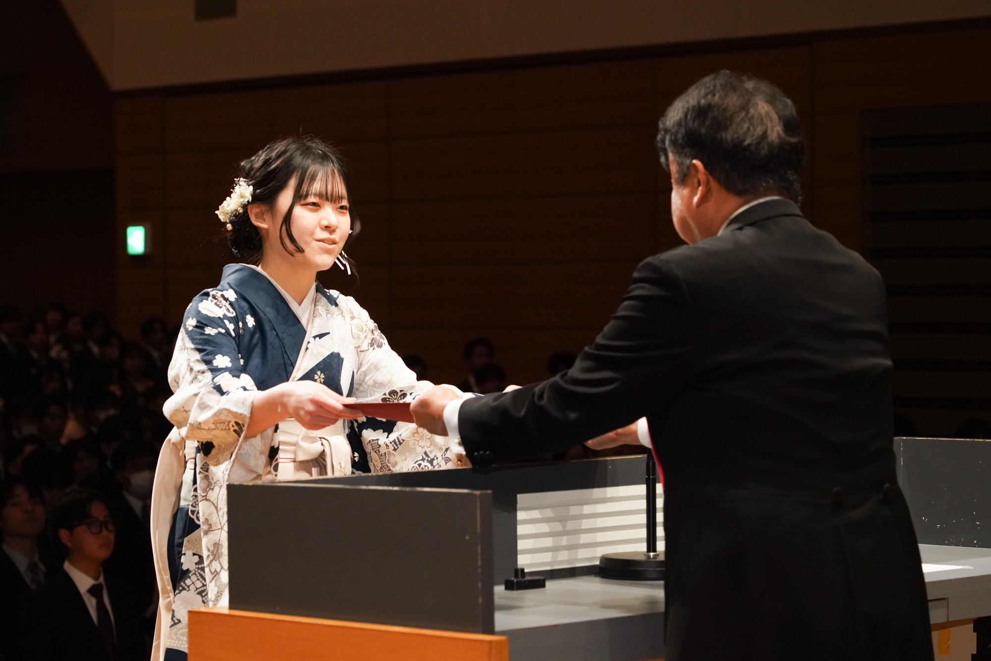 今年度は8学部3研究科が午前と午後の部に分かれ式典を行い、 午前の部では、卒業生総代の心理学部 心理学科 渋谷里奈さんと心理学研究科 心理学専攻 矢永志透さんに、午後の部では経営学部 経営学科 久保陽向さんと経営・経済研究科 経営・経済専攻 KANG JIAN(コウ ケン)さんに真銅 正宏学長から学位記が手渡されました。