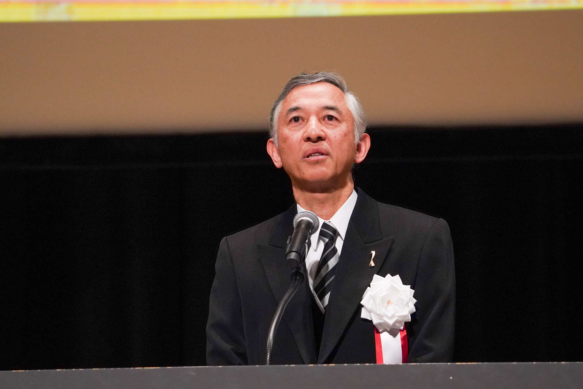 真銅 正宏学長は式辞で本学1期生で芥川賞作家である宮本輝さんが、卒業後の大変な時期を、小説を書き続けることで乗り越えたことに触れ「みなさんも宮本輝さんの小説執筆を続けることができた何かを探しあて、ぜひそれを続けてください。」と話しました。