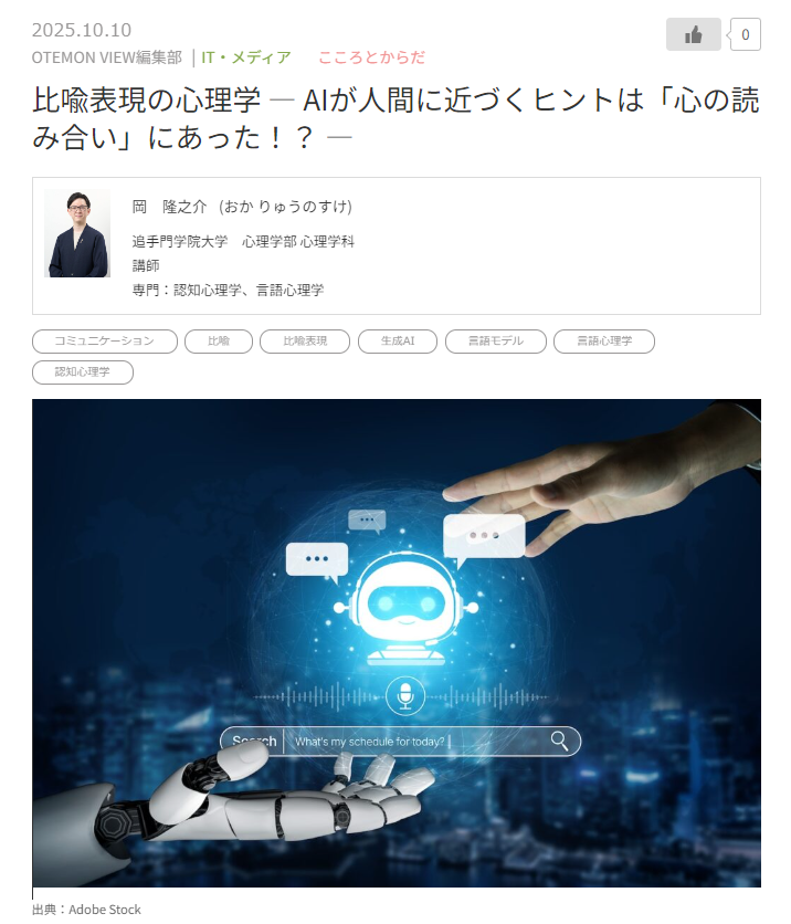 今回は、比喩表現がなぜ人間のコミュニケーションにおいて重要なのか、そしてAIがより人間らしいコミュニケーションを実現するためには何が必要なのかという問いに、心理学部・岡 隆之介講師と共に迫ります。