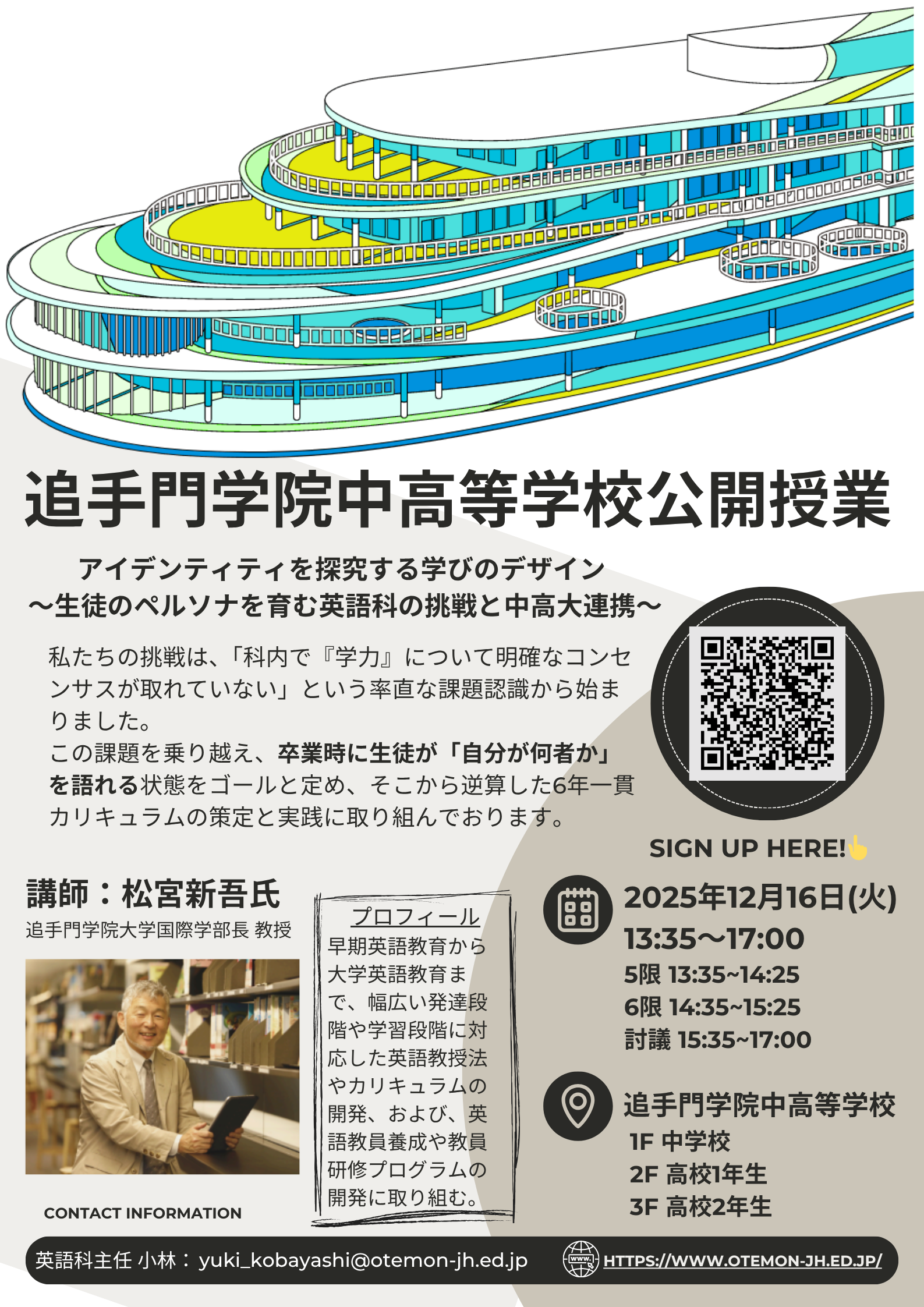 当日は、中学生および高校生の英語授業を公開したのち、参加者との討議を実施します。討議には、追手門学院大学 国際学部の松宮新吾教授(博士:学校教育学)を助言者として招聘し、初等中等・高等教育を接続した形で意見交換を行います