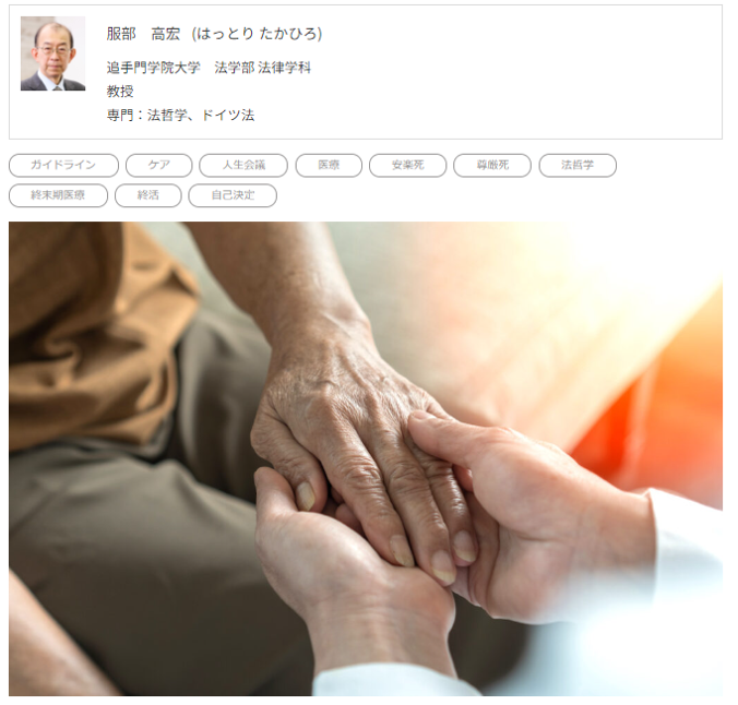 医療が大きく進歩した現代、人生の最終段階をどう過ごすかを検討することは身近な話題のひとつです。患者側が「過剰な医療を受けず、自然に最期を迎えたい」と願うのも考えの一つですが、現在の日本では、医師が患者の死期を早める措置をとる尊厳死・安楽死は合法化されていません。人生の最期について法はどこまで踏み込めるのでしょうか? 法哲学者の法学部 服部高宏教授と尊厳死・安楽死をめぐる日本の今を考えます。